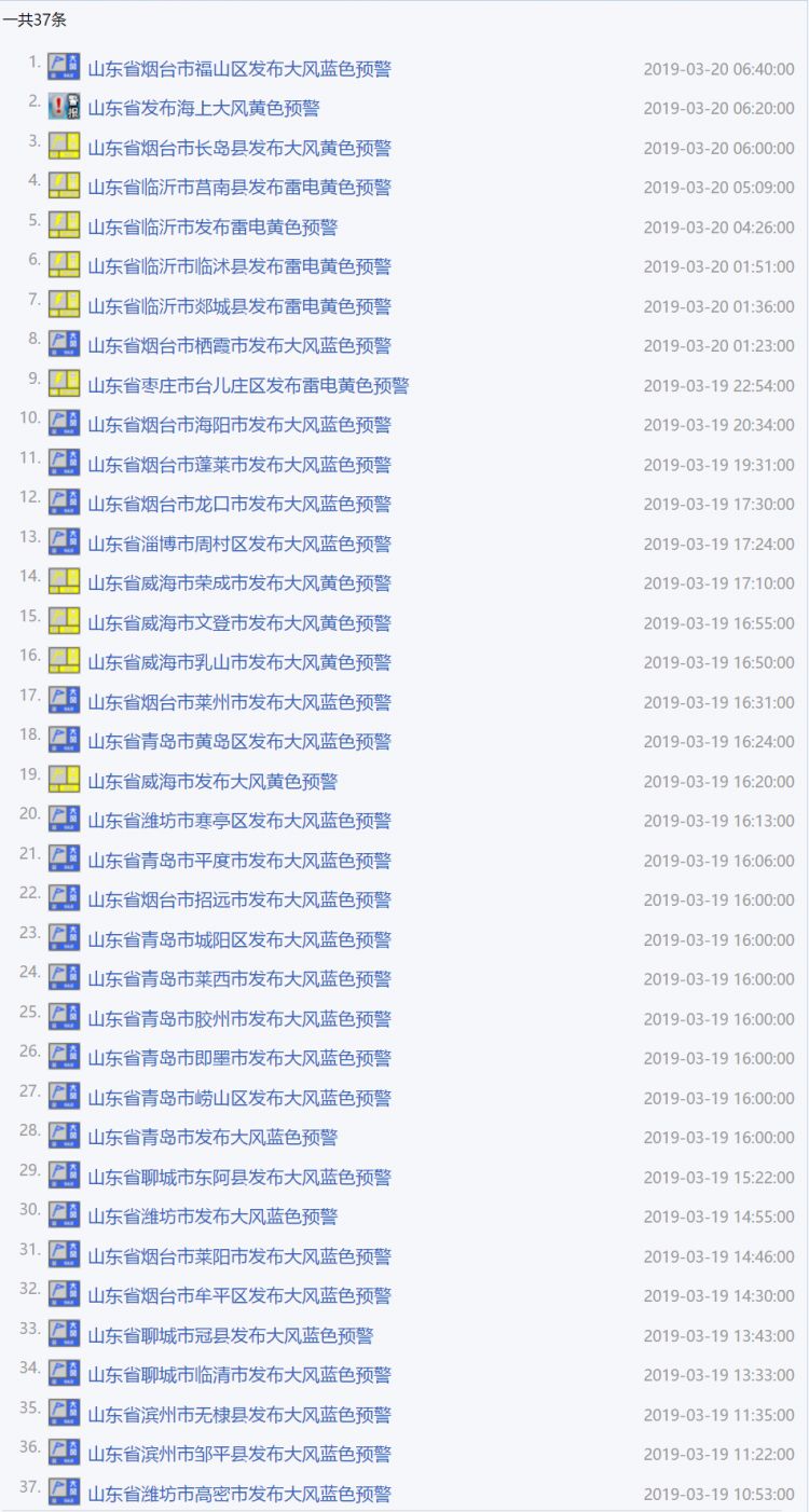 截止到20日早7點(diǎn),山東已發(fā)37個(gè)預(yù)警。