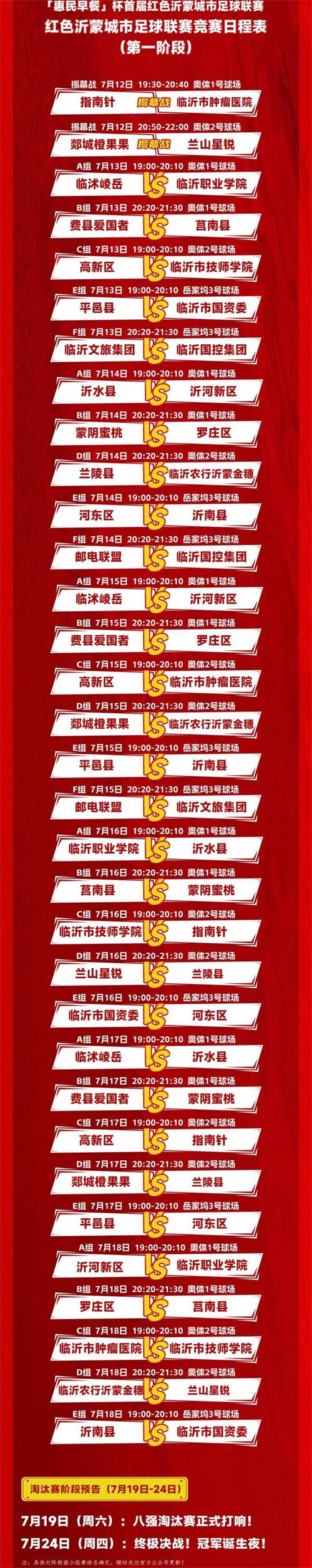 「惠民早餐」杯首屆紅色沂蒙城市足球聯(lián)賽揭幕戰(zhàn)第一場(chǎng)由指南針足球隊(duì)對(duì)陣臨沂市腫瘤醫(yī)院足球隊(duì),以7:1比分結(jié)束比賽。第二場(chǎng)由郯城橙果果足球隊(duì)對(duì)陣蘭山星銳足球隊(duì),郯城橙果果足球隊(duì)在比賽最終時(shí)刻絕殺,以2:1比分結(jié)束比賽。本屆賽事將持續(xù)至7月24日。在未來(lái)的12天里,小組賽及淘汰賽將逐日在臨沂奧體公園訓(xùn)練場(chǎng)和岳家塢球場(chǎng)展開。八強(qiáng)淘汰賽將于7月19日拉開戰(zhàn)幕,最終的冠軍爭(zhēng)奪戰(zhàn)則定于7月24日決戰(zhàn)。