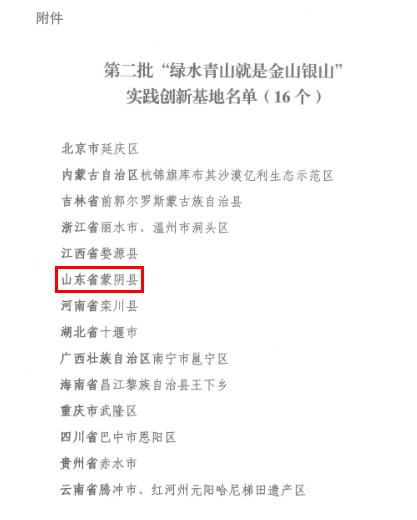 2018年12月12日,生態(tài)環(huán)境部發(fā)布《關(guān)于命名第二批“綠水青山就是金山銀山”實踐創(chuàng)新基地的公告》,蒙陰縣榜上有名,成為山東省唯一獲此榮譽的縣區(qū)。